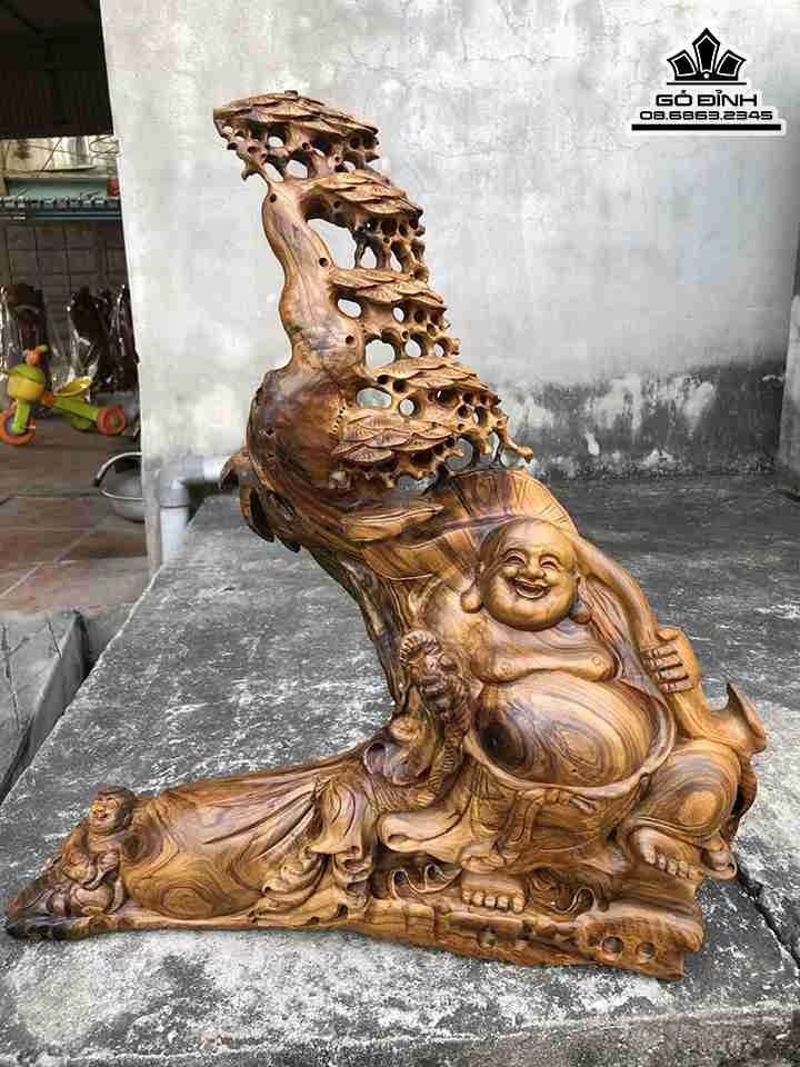 Tượng Phật Di Lặc Vác Gậy Như Ý Gỗ Bách Xanh Cao 54 Rộng 48 Dày 13 (cm)
