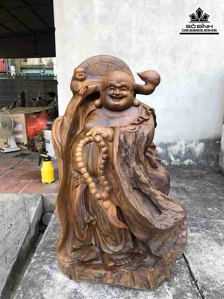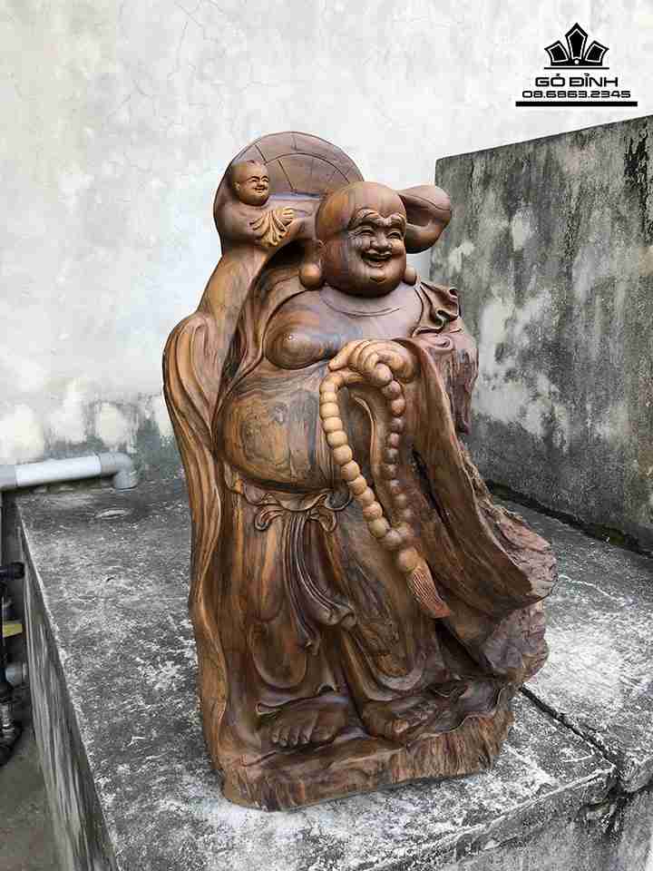Tượng Phật Di Lặc Vác Gậy Như Ý Gỗ Bách Xanh Cao 75 Ngang 45 Sâu 37 (cm)