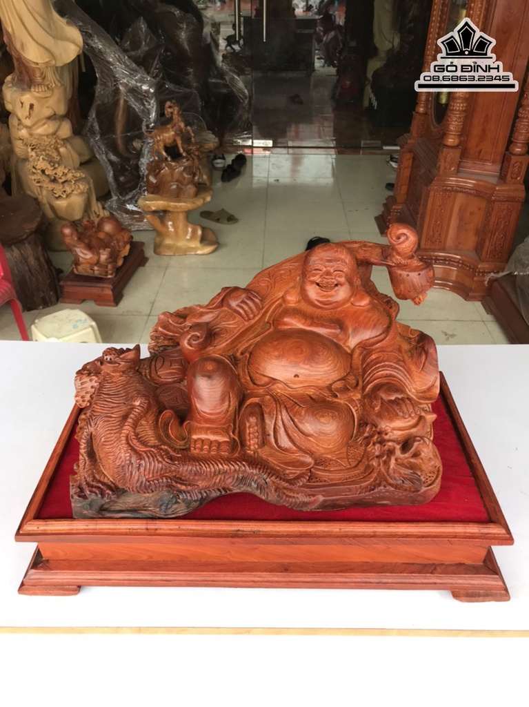 Tượng Phật Di Lặc Vác Gậy Như Ý Gỗ Hương Việt Cao 28 Ngang 46 Sâu 40 (cm)