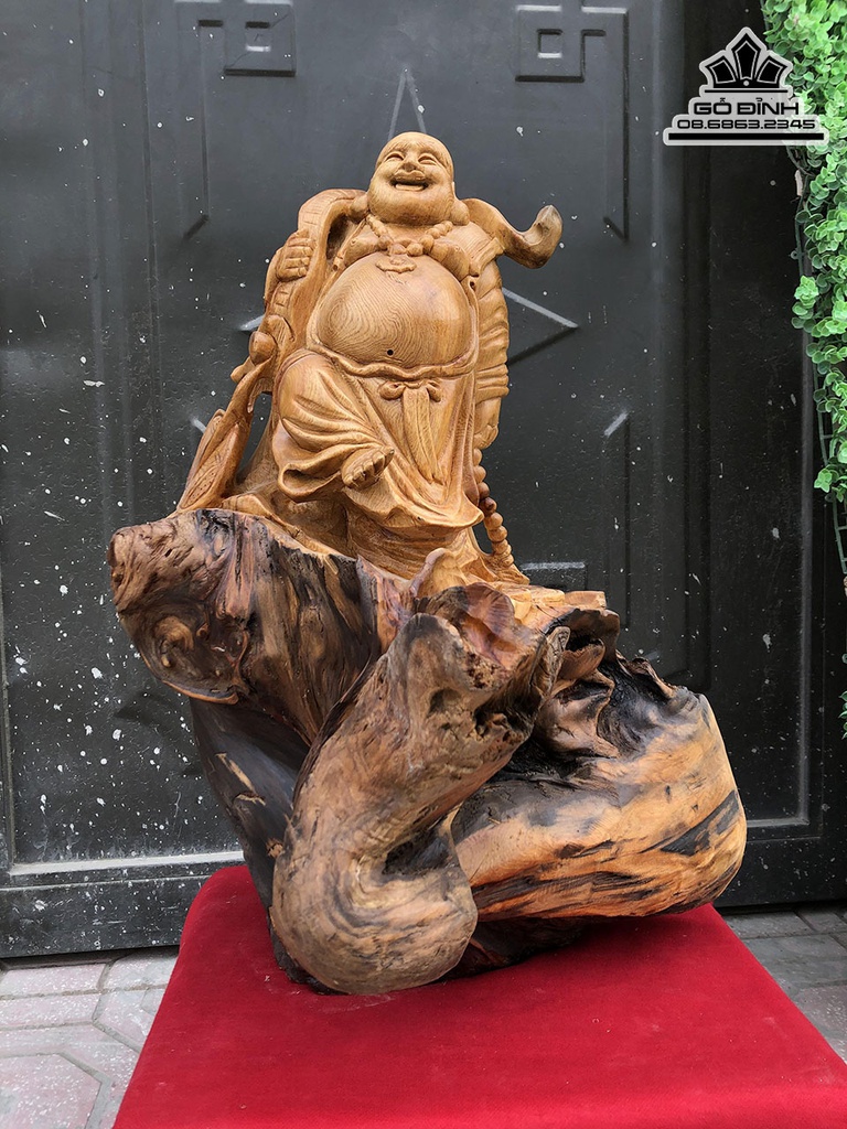 Tượng Phật Di Lặc Vác Gậy Như Ý Gỗ Pơ Mu Cao 57 Ngang 45 Sâu 37 (cm)