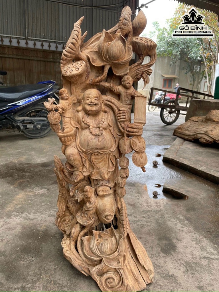 Tương Phật Di Lặc Vác Sen Gỗ Ngọc Am Cao 107 Ngang 55 Sâu 32 (cm)