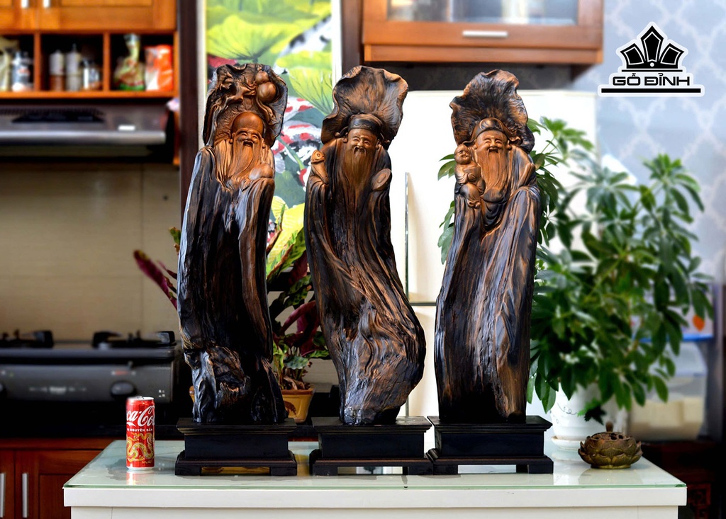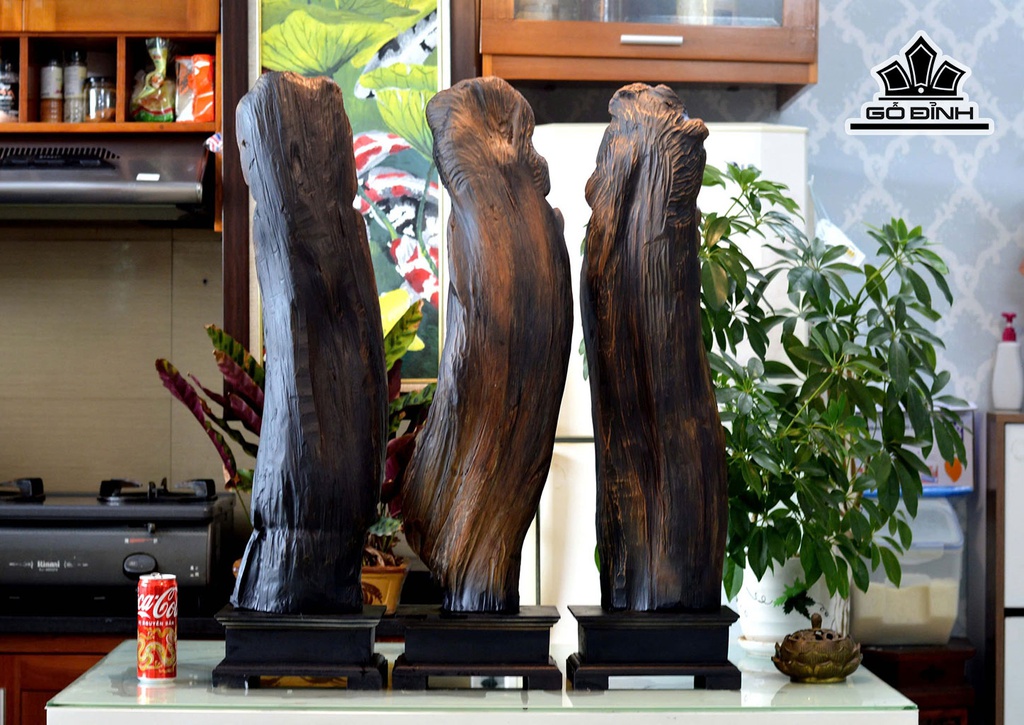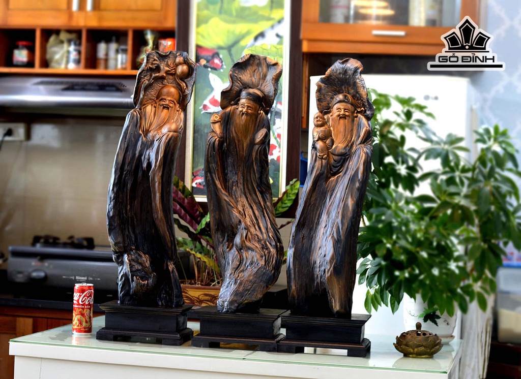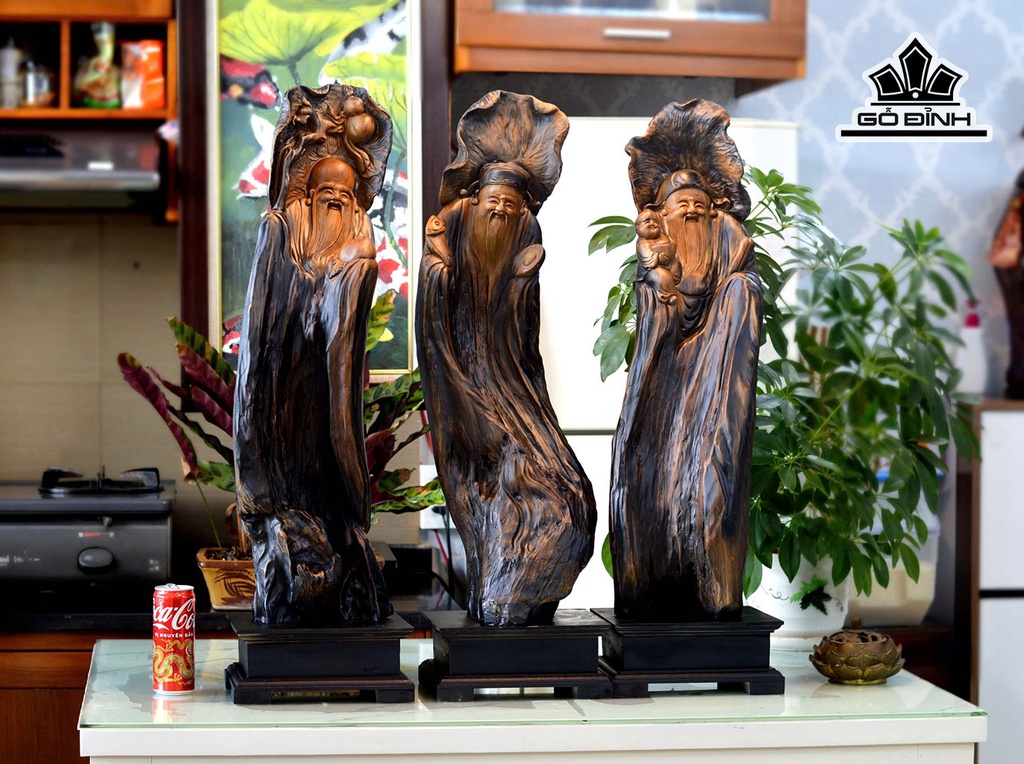 Tượng Phúc Lộc Thọ (Tam Đa) Gỗ Lũa Bách Xanh Cao Cả Kỷ 85 Riêng Kỷ Cao 10 Ngang 22 Sâu 15 (cm)