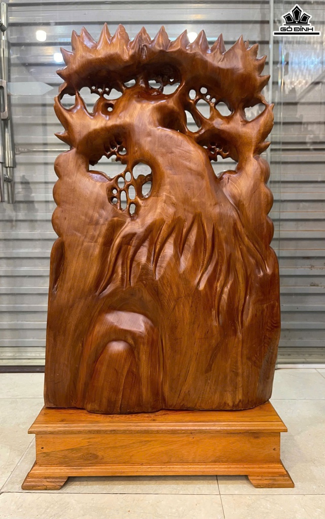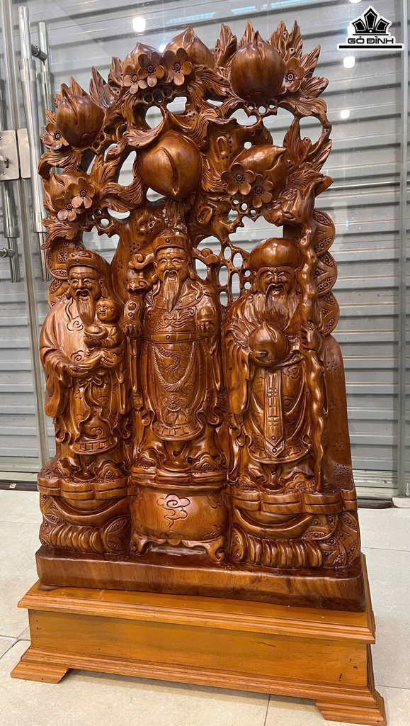 Tượng Phúc Lộc Thọ (Tam Đa) Vác Đào Gỗ Ngọc Am Cao Cả Kỷ 110 Ngang 59 Sâu 21 (cm) - Kỷ Cao 15 (cm)