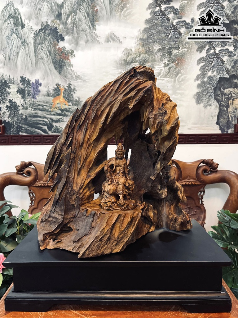 Tượng Quan Âm Tự Tại Gỗ Bách Xanh Cao 38 Ngang 35 Sâu 20 (cm)