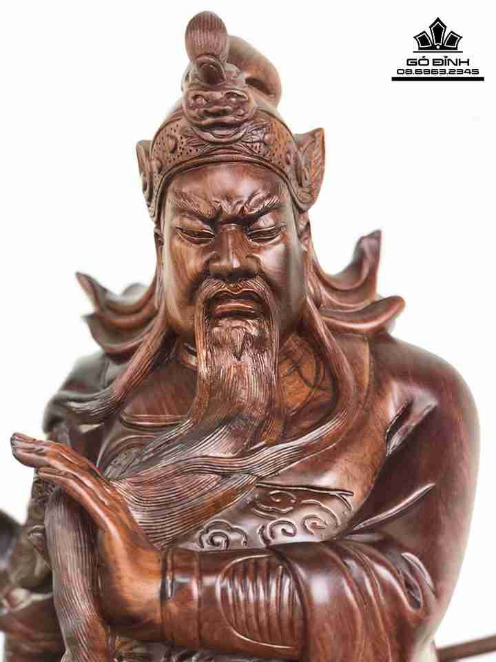 Quan công luôn xuất hiện với hình ảnh khí khái mãnh liệt, gương mặt cương quyết có phần dữ dằn, mặt đỏ và dâu dài, trên tay cầm long đao luôn trong tư thế sẵn sàng. Tượng Quan Công có gương mặt càng dữ thì hiệu quả bảo vệ càng mạnh. Với tướng đứng hùng dùng trên tay cầm thanh đao, gương mặt cương nghị thể hiện khí khái anh hùng không thể dễ dàng khuất phục, không những dùng để trang trí mà còn góp phần tạo nên sự uy nghiêm, trang trọng cho căn phòngcủa bạn.