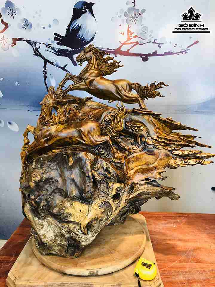 Tượng Song Mã Uyên Ương Gỗ Bách Xanh Cao 80 Rộng 75 Sâu 35 (cm)