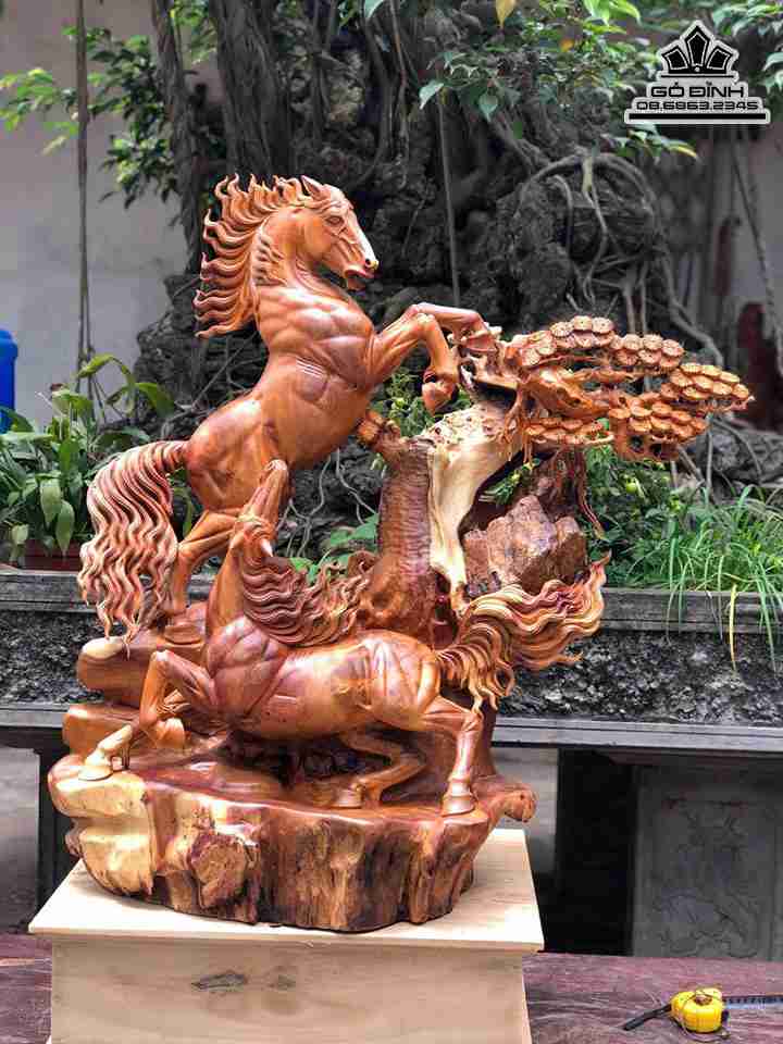 Tượng Song Mã Uyên Ương Gỗ Hương Cao 83 Rộng 83 Sâu 40 (cm)