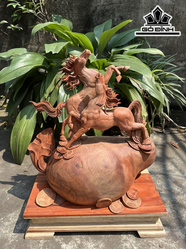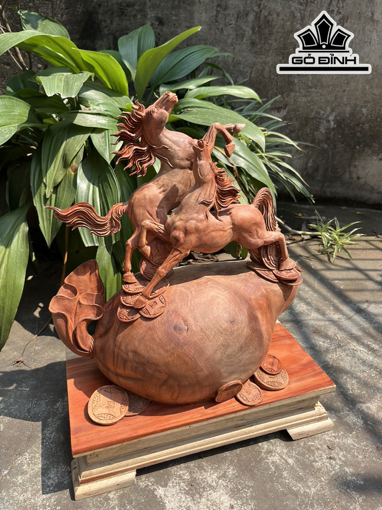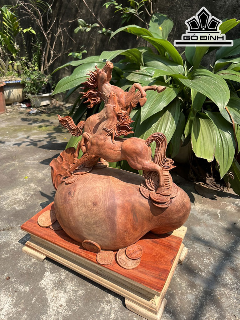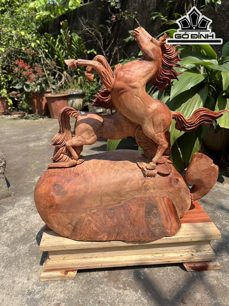 Tượng Song Mã Uyên Ương Gỗ Hương Cao 41 Ngang 43 Sâu 20 (cm)