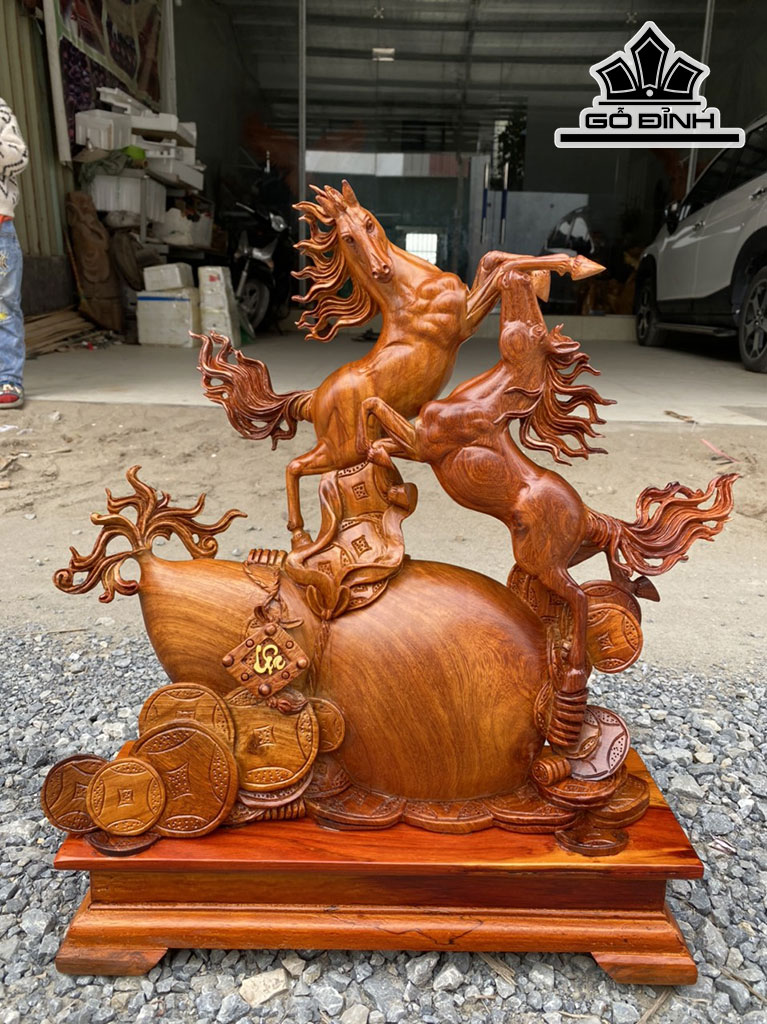 Tượng Song Mã Uyên Ương Gỗ Hương Cao Cả Kỷ 52 Ngang 43 Sâu 16 (cm)