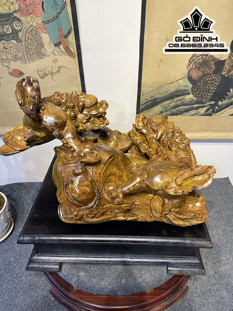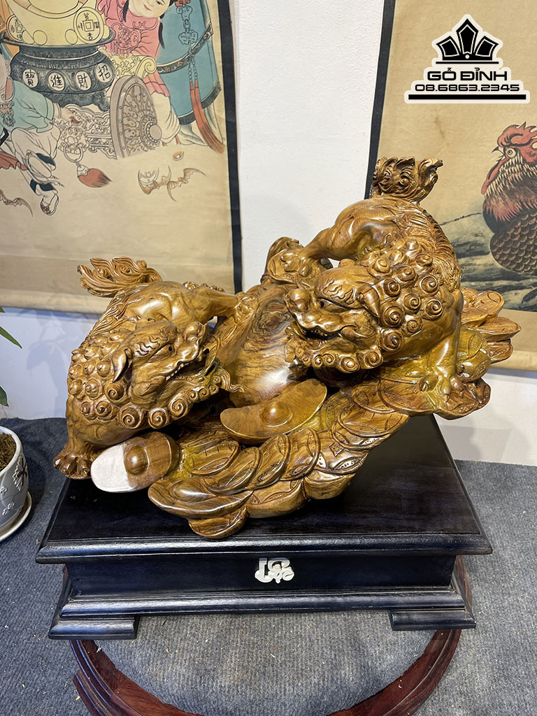 Tượng Song Nghê Gỗ Bách Xanh Cao 32 Ngang 50 Sâu 38 Cả Kỷ 45 (cm)