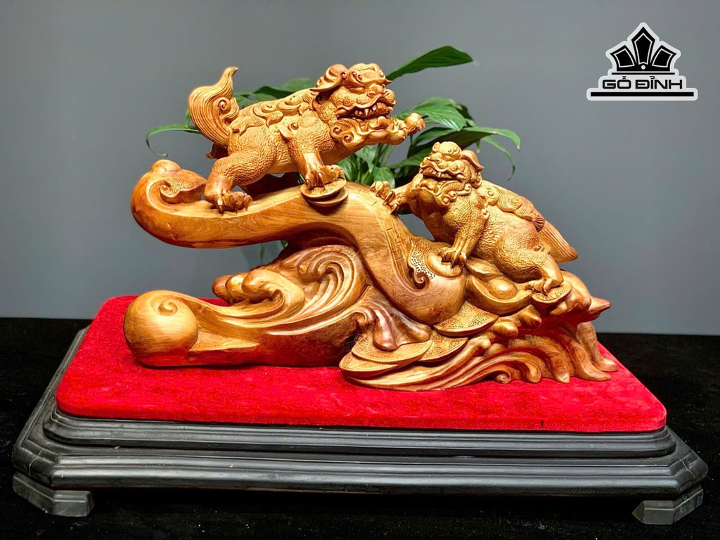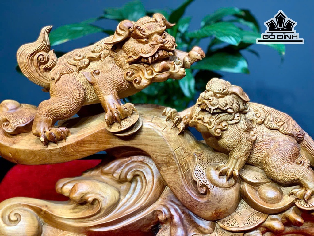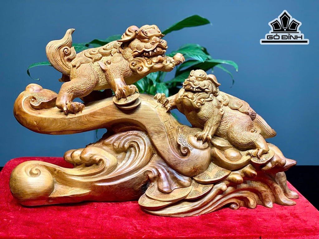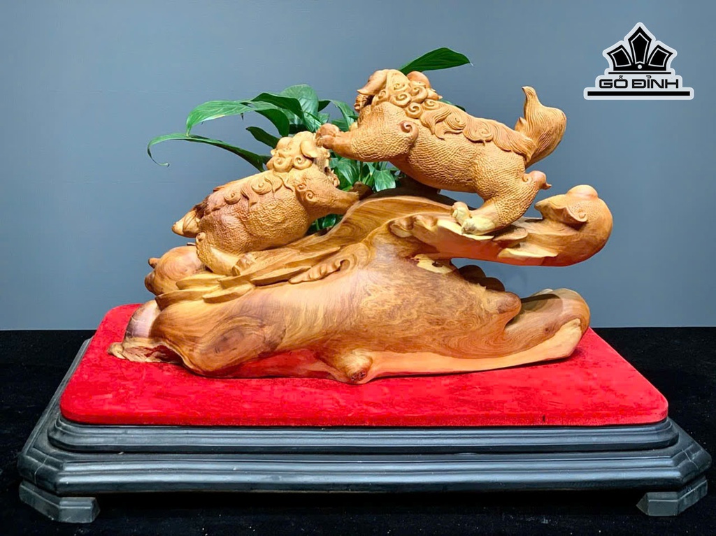 Tượng Song Nghê Gỗ Hương Cao 32 Ngang 52 Sâu 20 (cm)