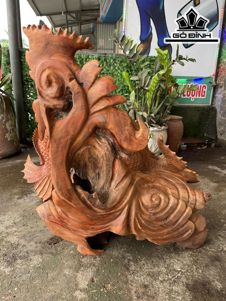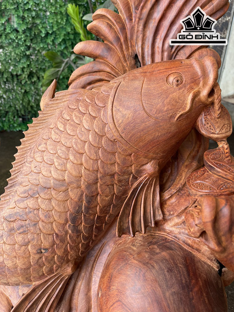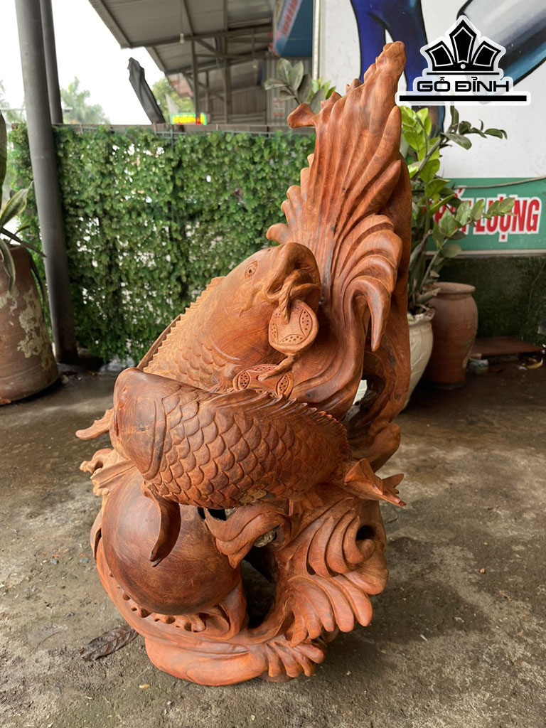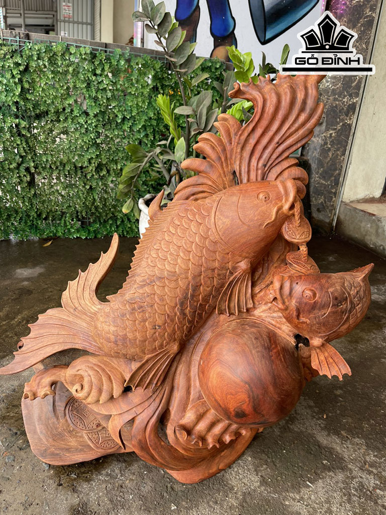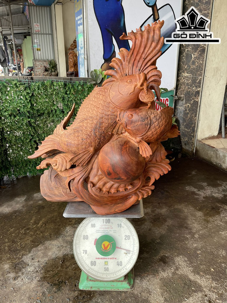 Tượng Song Ngư Vờn Ngọc Gỗ Hương Cao 70 Ngang 60 Sâu 40 (cm)