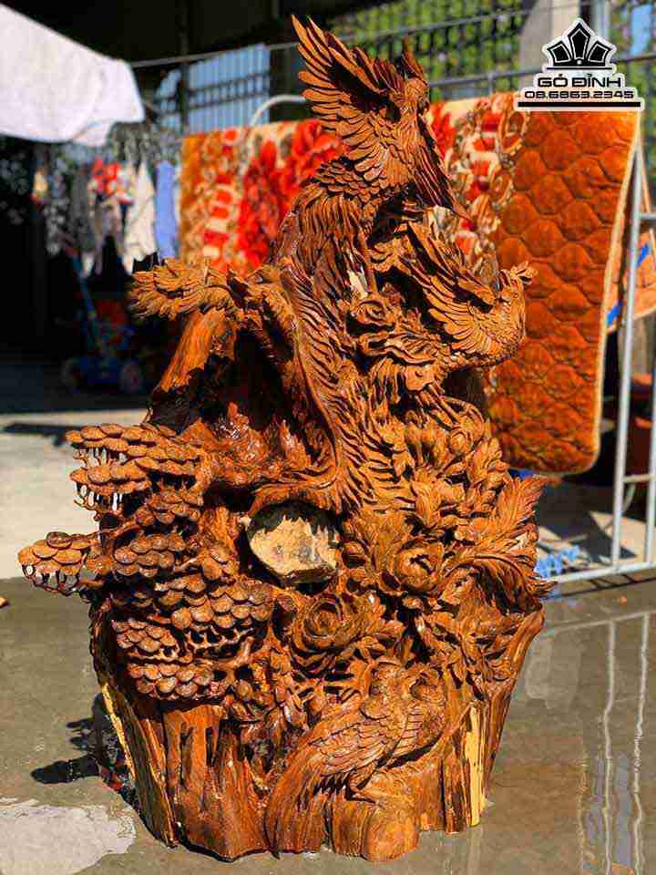 Tượng Song Phụng Uyên Ương Gỗ Hương Cao 118 Rộng 92 Dày 36 (cm)