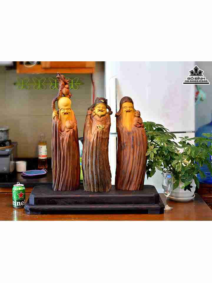 Tượng Tam Đa Phúc Lộc Thọ Gỗ Bách Xanh Cao 60 Ngang 16 Dày 12 (cm) tính cả kỷ kê