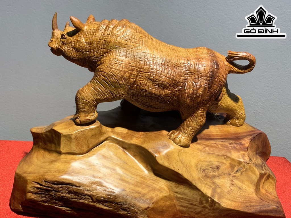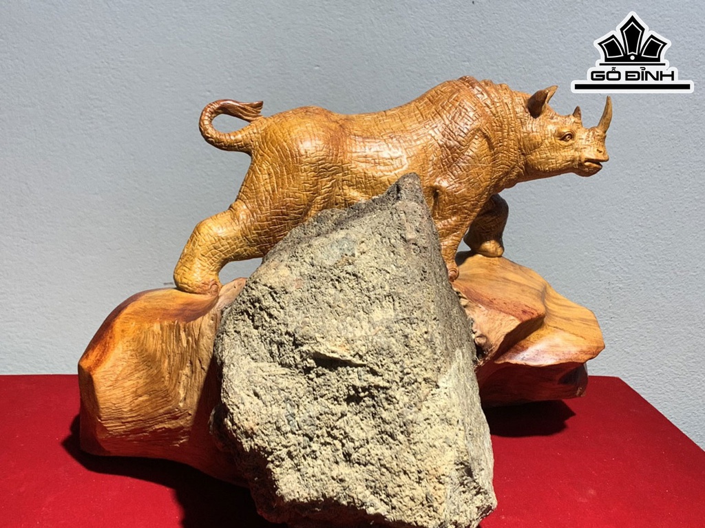 Tượng Tê Giác Gỗ Hương Ôm Đá Cao 20 Ngang 30 Sâu 25 (cm)