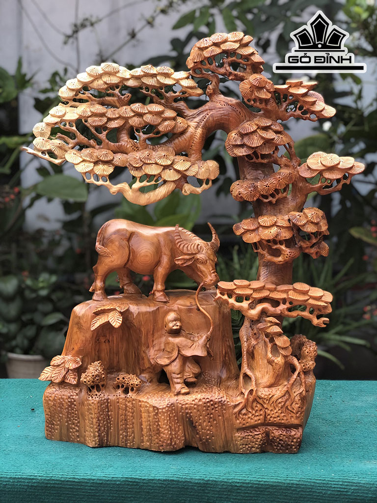 Tượng Tiểu Đồng Chăn Trâu Gốc Tùng Gỗ Hương Cao 63 Ngang 50 Sâu 20 (cm)