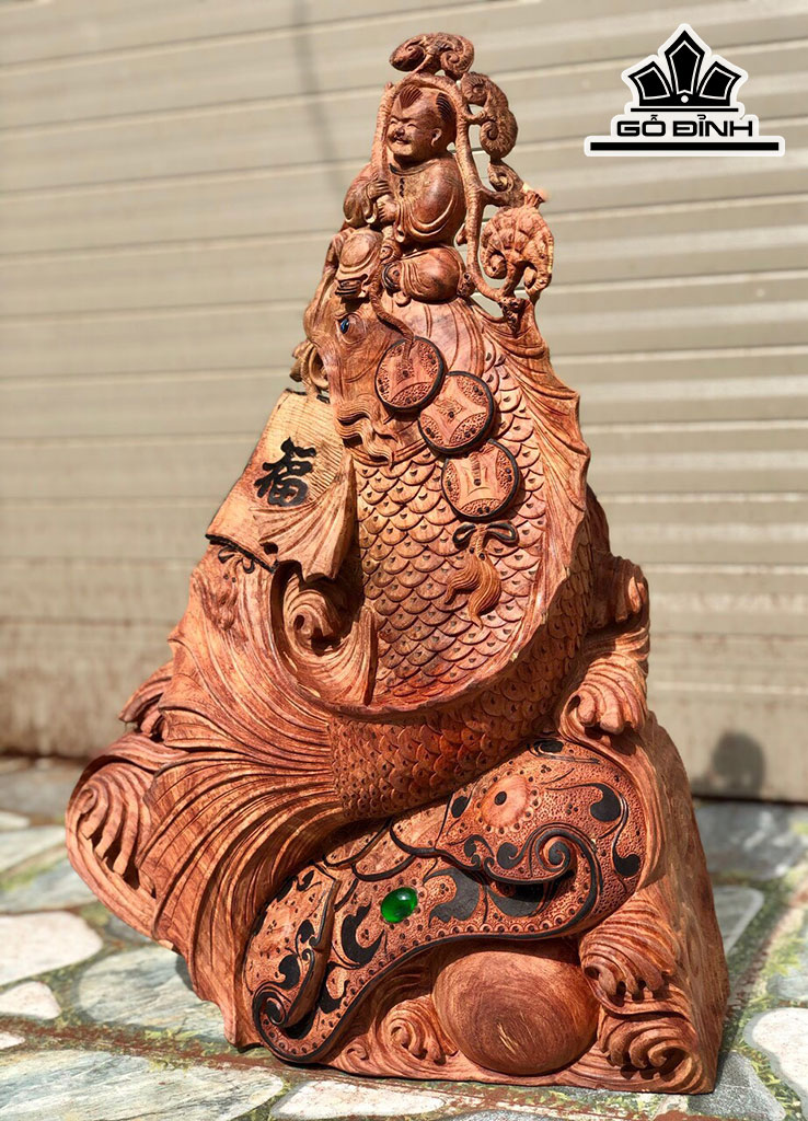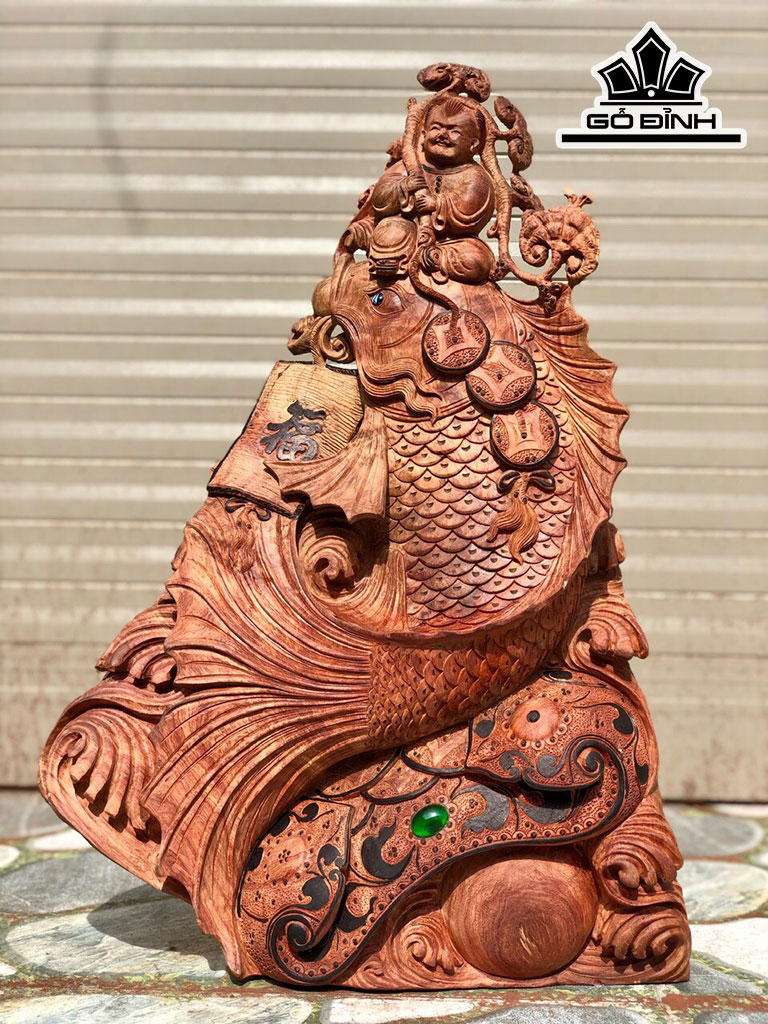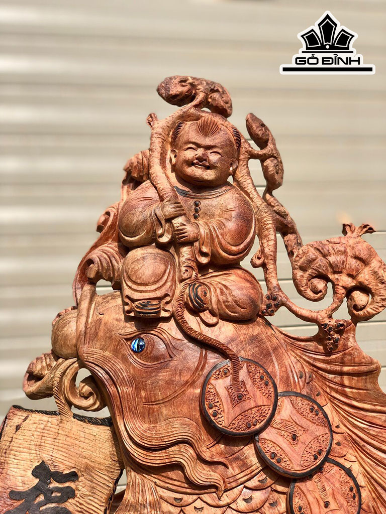 Tượng Tiểu Đồng Cưỡi Cá Chép Gỗ Hương