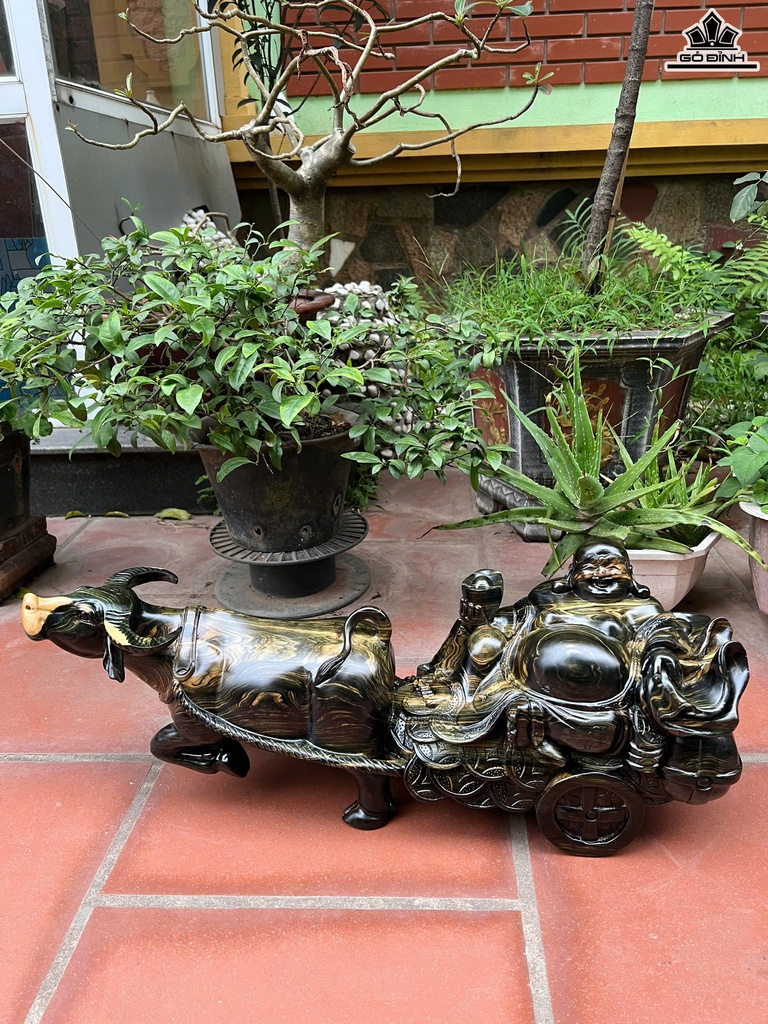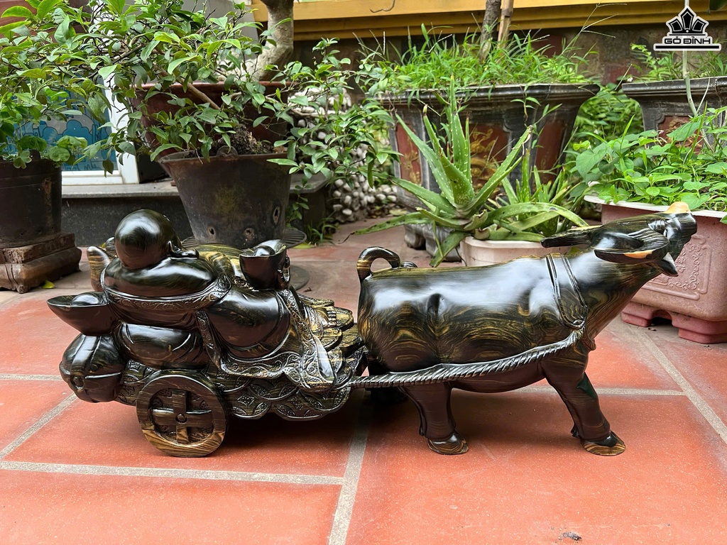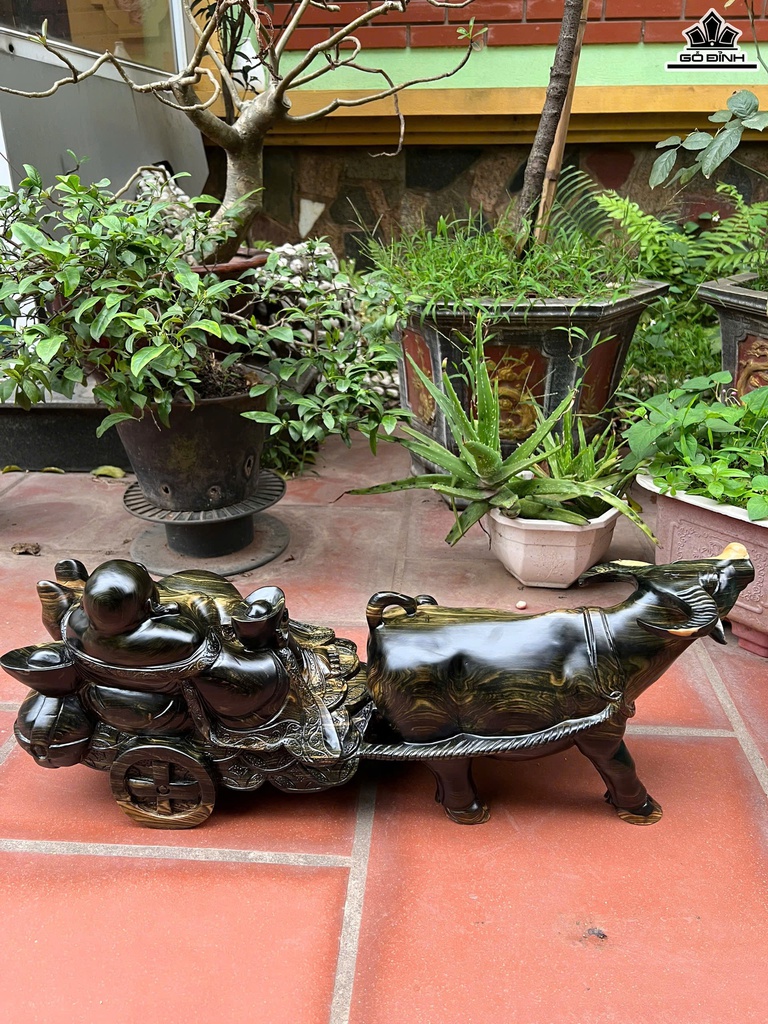 Tượng Trâu Kéo Xe Di Lặc Gỗ Mun Hoa Cao 27 Ngang 70 Sâu 19 (cm)