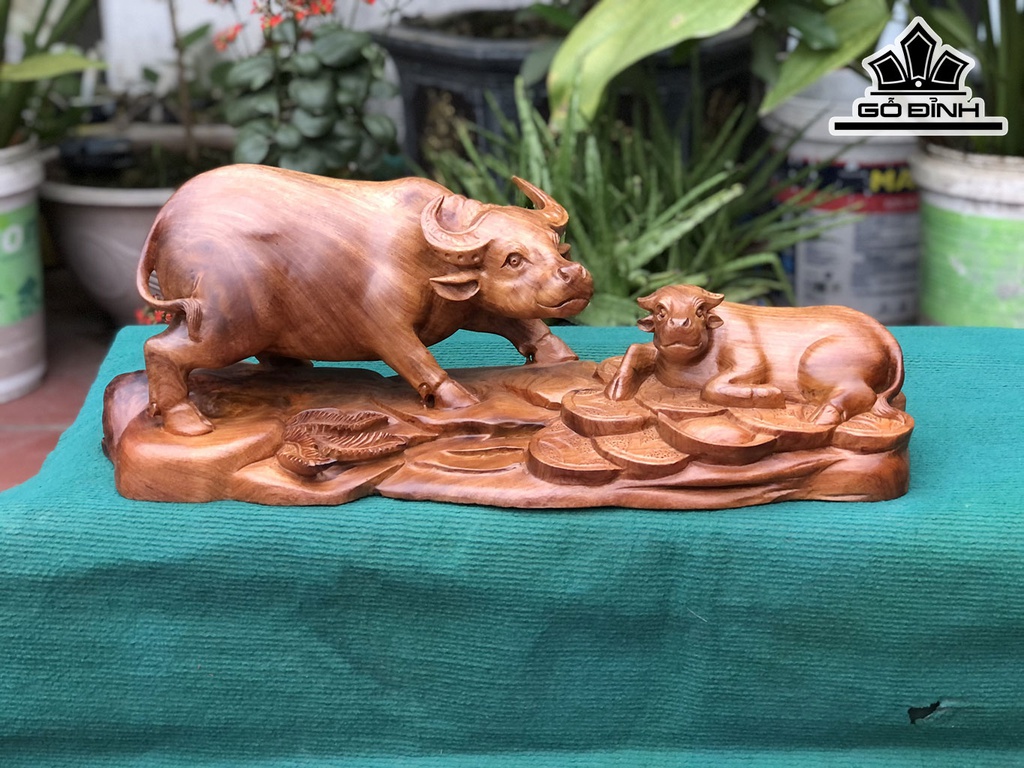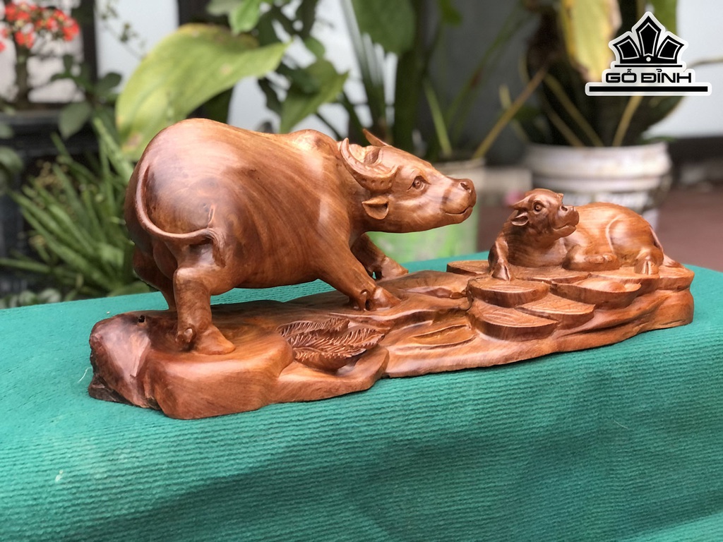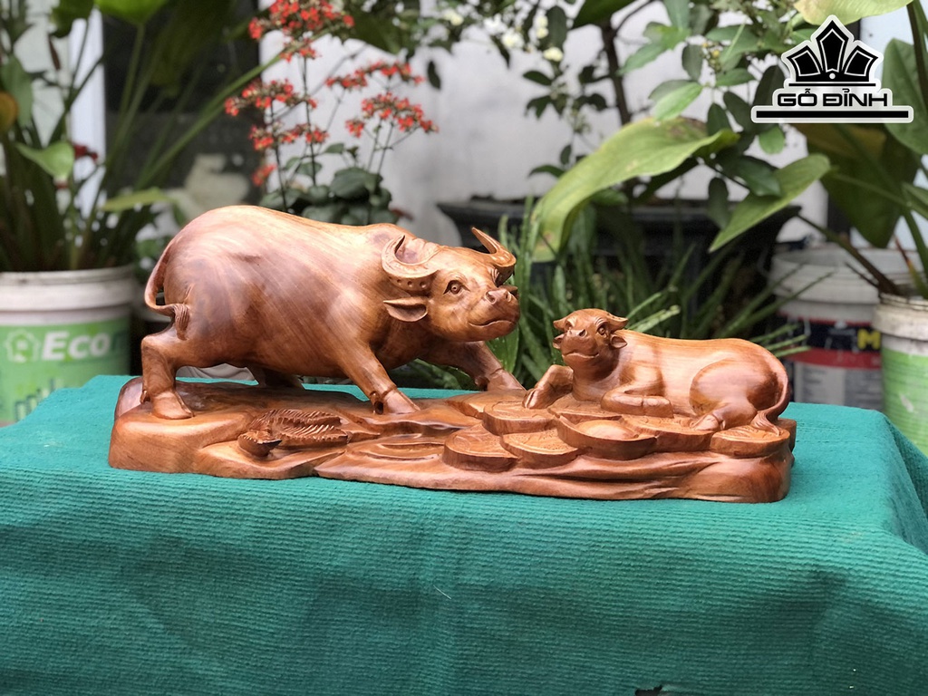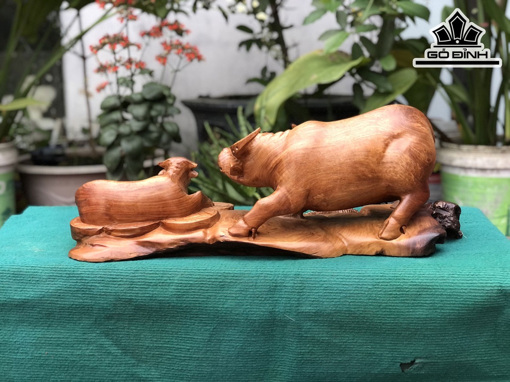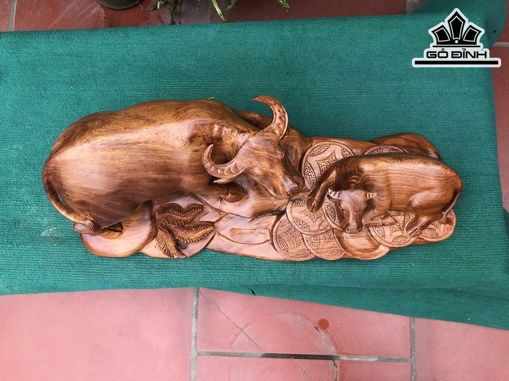 Tượng Trâu Mẫu Tử Gỗ Hương Cao 24 Ngang 63 Sâu 24 (cm)