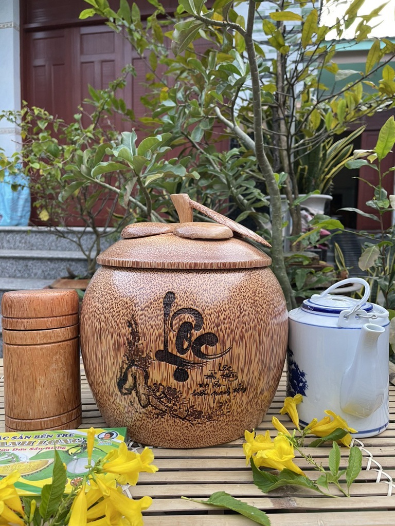 Vỏ Bình Giữ Nhiệt Nắp Măng Cụt Khắc Chữ Lộc Gỗ Dừa Loại 2,5 Lít