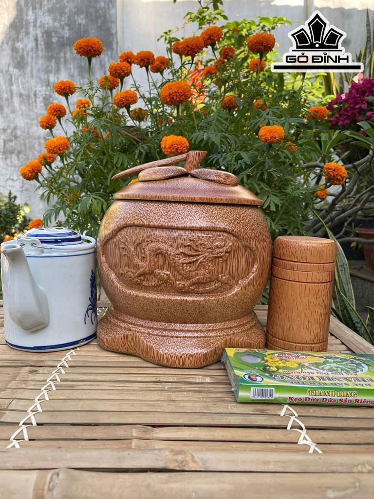 Vỏ Bình Giữ Nhiệt Nắp Măng Cụt Khắc Rồng (Nhất Long) Gỗ Dừa Loại 0,8 Lít