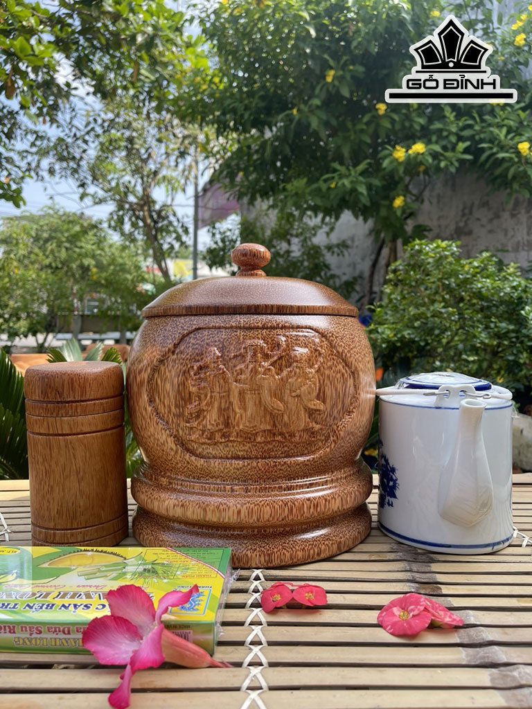 Vỏ Bình Giữ Nhiệt Nắp Nút Khắc Tam Đa Gỗ Dừa Loại 1,5 Lít