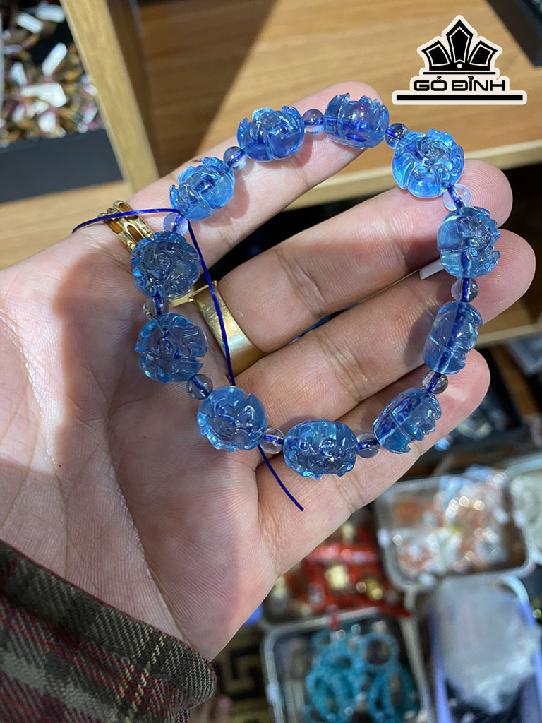 Vòng Tay Đá Aquamarine Chạm Hoa Sen Cao 13,5 Ngang 7,8 (mm) 26g